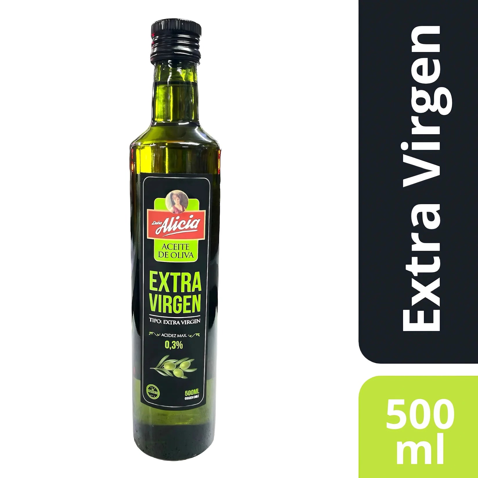 Extra Virgen Doña Alicia. Con solo 500ml, puedes disfrutar de su calidad excepcional en cada platillo. Añade un toque de sabor y salud a tus comidas con este aceite de oliva de alta calidad. ¡Haz que tus platos sean irresistibles!