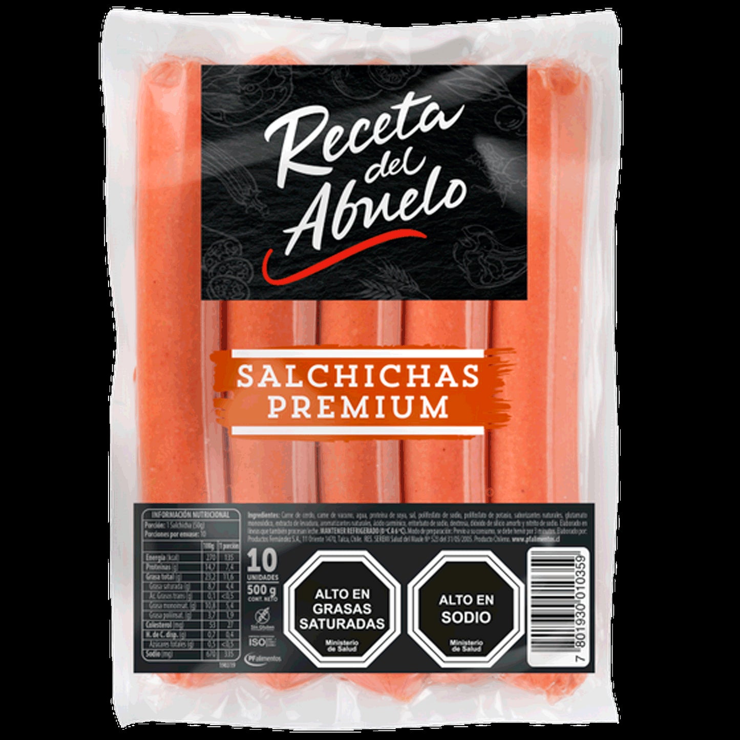Salchichas de línea premium, con receta casera “del abuelo”. Sabor intenso, elaboradas con carne de alta calidad.